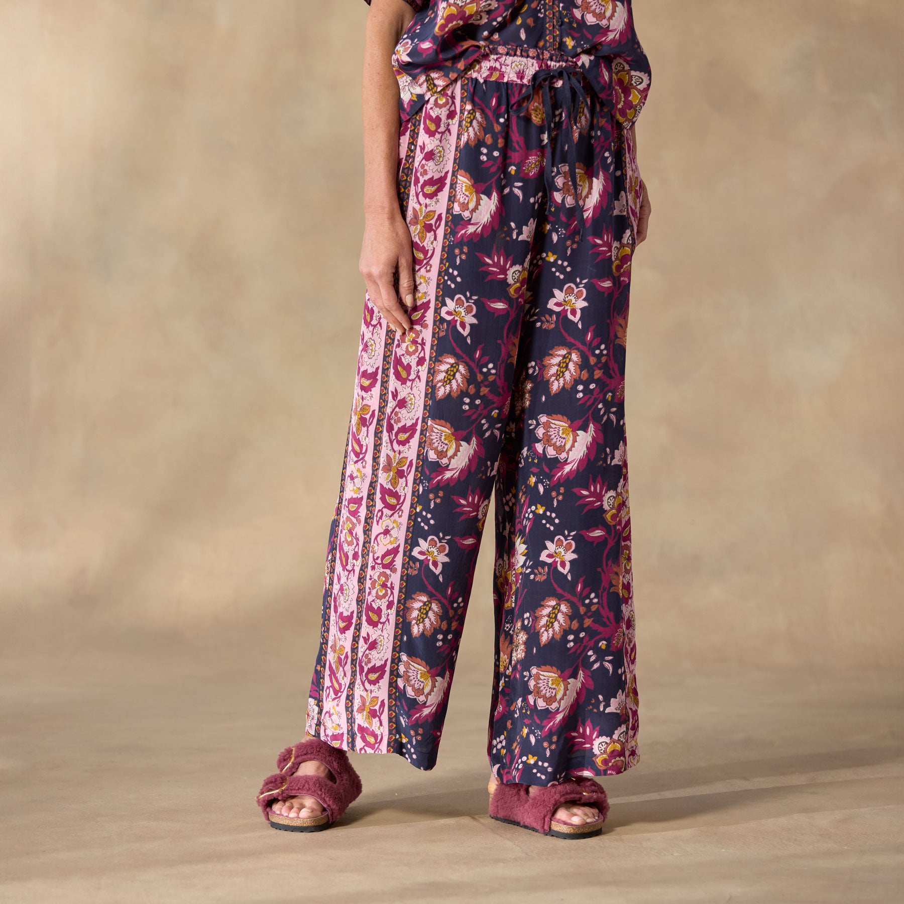 Silky and gorgeous mixed and border print pajama bottoms. so elegant. with wide leg silhouette. elastic drawstring waistband with ruffle detail and side seam pockets. Easy fit and flowing. Viscose. Machine wash. Imported. Exclusive. Sizes XS (0–2). S (4–6). M (8–10). L (12–14). XL (16–18). XXL (20–22). 28 inseam.