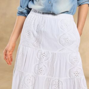 Our easygoing Ensenada Skirt features breezy tiered eyelet in a versatile midi length with a forgiving elastic waistband and a charming scalloped hem. Cotton. Machine wash. Imported. Exclusive. Sizes XS (0-2). S (4-6). M (8-10). L (12-14). XL (16-18). XXL (20-22). Approx. 36l.