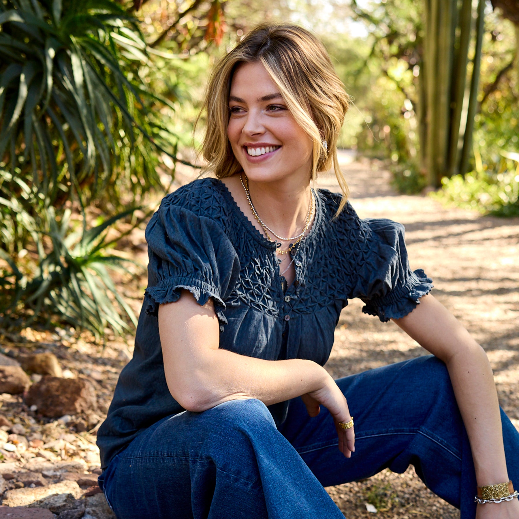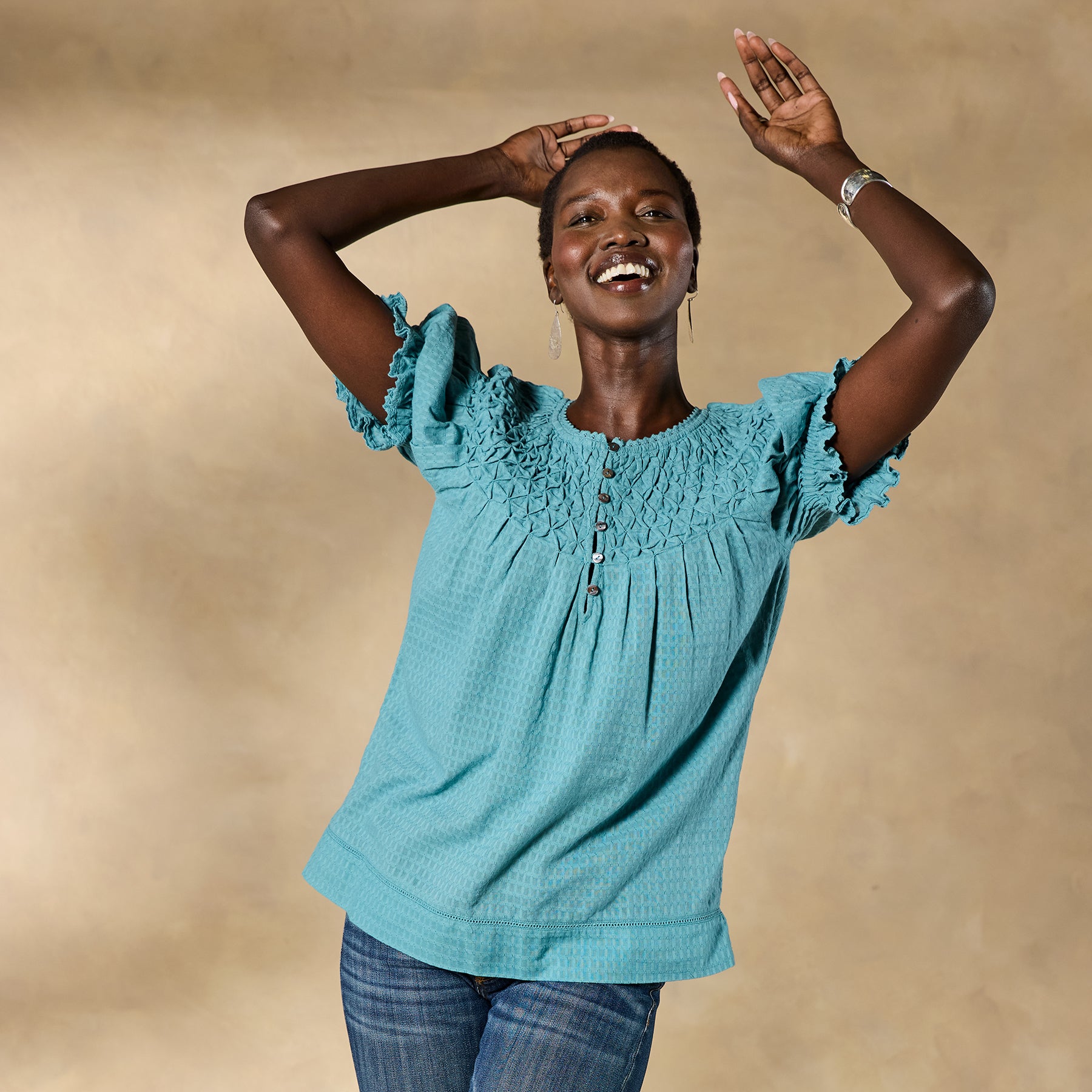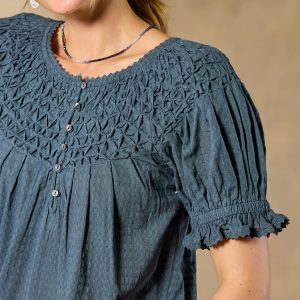 Feminine and textured. our Lodi Top is designed in bold colors with intricate details of lace and pineapple smocking. Button placket with loop closure. Elastic cuffs. Cotton. Machine wash. Imported. Exclusive. Sizes XS (0?C2). S (4?C6). M (8?C10). L (12?C14). XL (16?C18). XXL (20?C22). Approx. 24.5l.