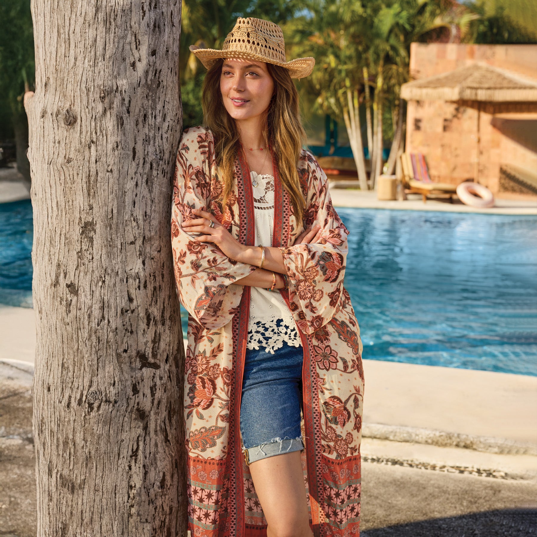 From morning coffee on the patio to après-beach time and beyond. our easy. open-front kimono elevates your every day. With an elegant drape that will make you feel beautiful. charming border print and side-seam pockets. Viscose. Machine wash. Exclusive. Sizes XS (0–2). S (4–6). M (8–10). L (12–14). XL (16–18). XXL (20–22). Approx. 43.5l.