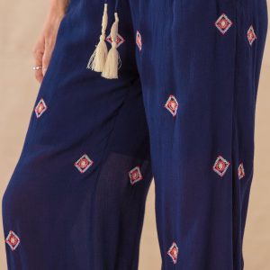 Our Niovi Pants are fashioned from the most delightful crinkle rayon crepe for the easiest. breeziest lightweight feel. In a cropped. wide-leg silhouette. with colorful allover embroidery and crochet tassel detail on elastic waistband tie. Great travel pants! Hand wash. Imported. Exclusive. Sizes XS (0–2). S (4–6). M (8–10). L (12–14). XL (16–18). XXL (20–22). 23 inseam.