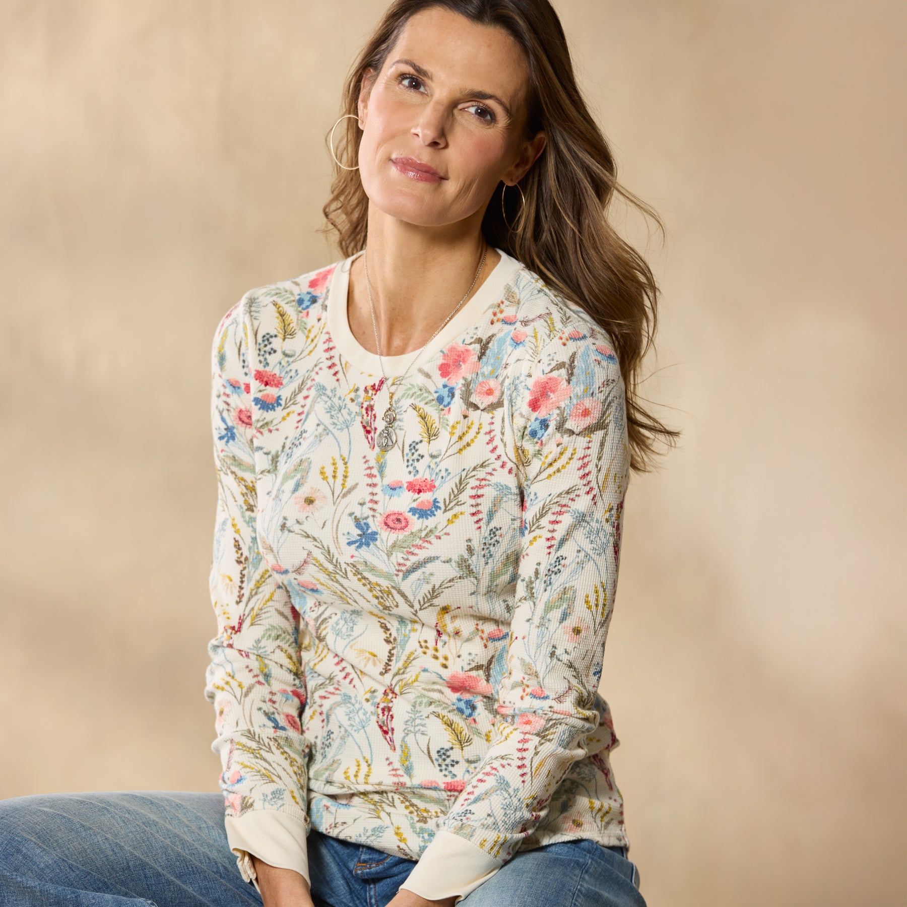 Our Sausalito is an update to a Sundance favorite??a cozy crewneck thermal in the loveliest floral print! Three-quarter sleeves with rib trim at the cuffs and neckline. Cotton/spandex. Machine wash. Imported. Exclusive. Sizes XXS (00). XS (0?C2). S (4?C6). M (8?C10). L (12?C14). XL (16?C18). Approx. 23.5l.