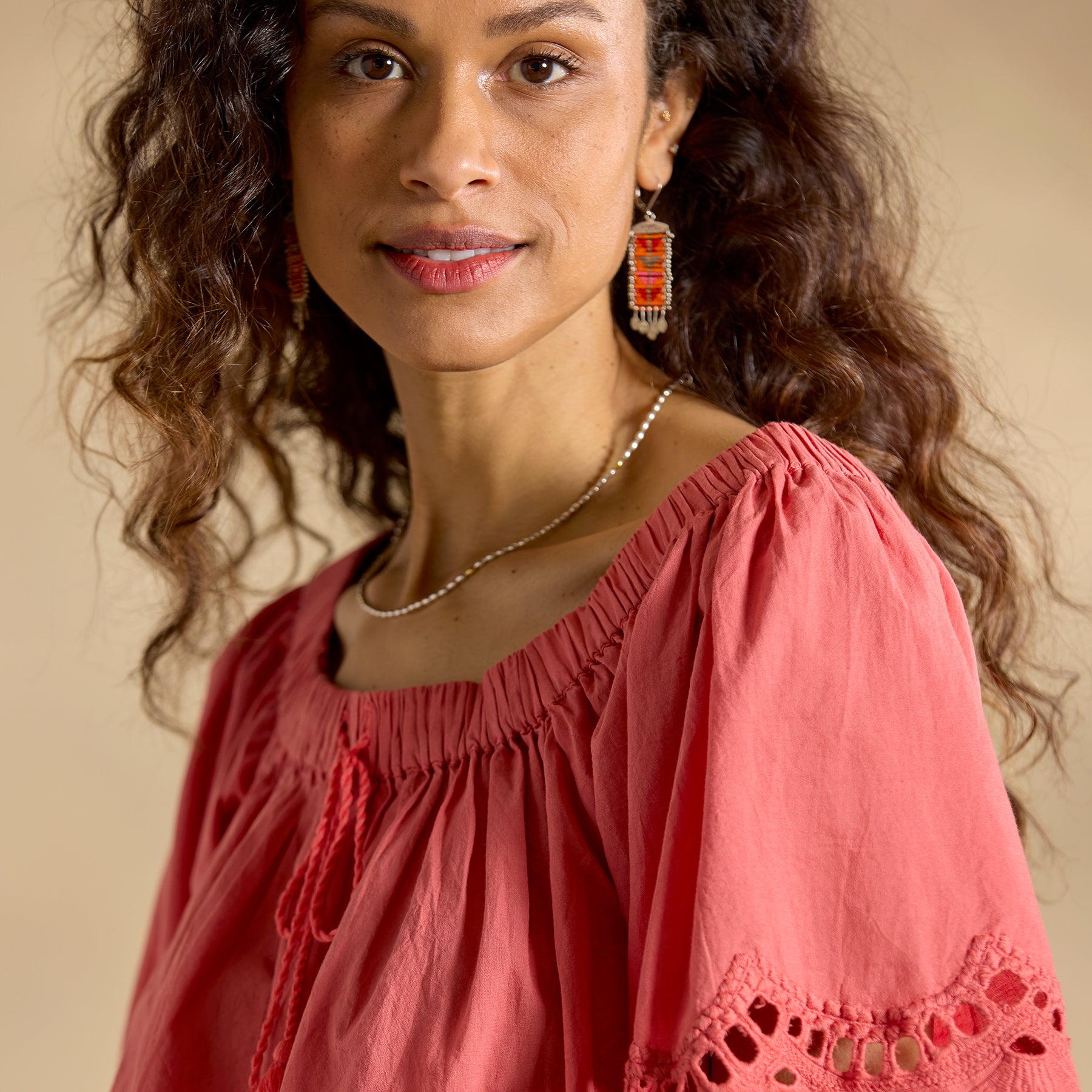 This relaxed. flowy blouse can be worn on or off the shoulder and features a smocked neckline with tasseled tie. cut-out details and embroidery. Cotton. Machine wash. Imported. Sizes XS (0-2). S (4-6). M (8-10). L (12-14). XL (16-18). XXL (20-22). Approx. 24.5l.